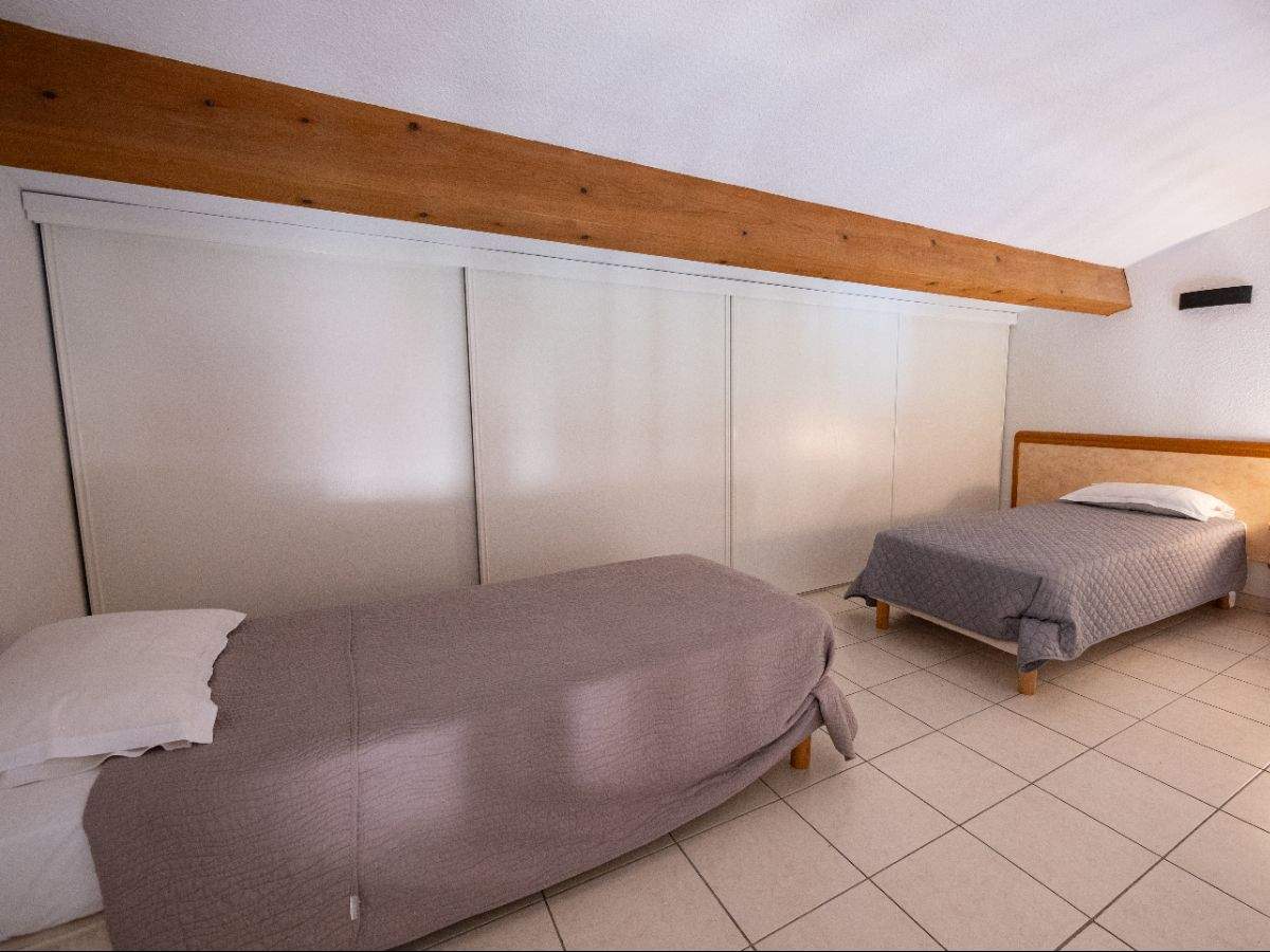 - Un lit en 140 cm au rez-de-chaussée et 2 lits jumeaux à l’étage.